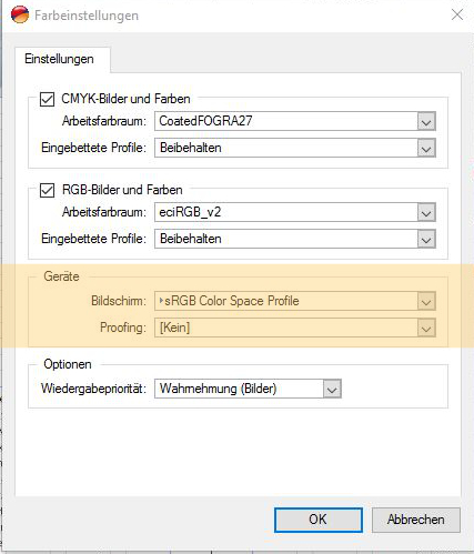 - Wählen Sie für das Gerät “Bildschirm” ein sRGB-Profil aus.