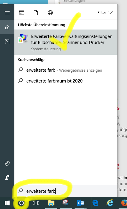 - Geben Sie in der Windows-Suche/Cortana den Begriff ein: “Erweiterte Farbeinstellungen” und klicken dann auf den Treffer (im Screenshot mit gelbem Haken gekennzeichnet)