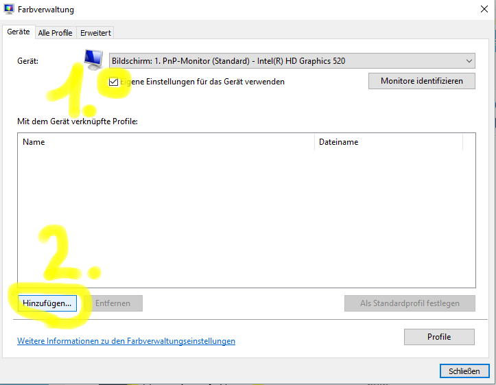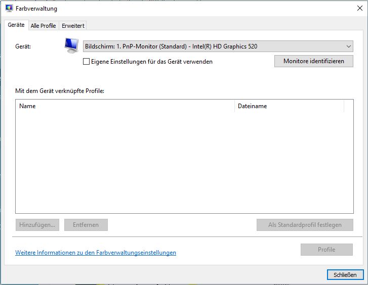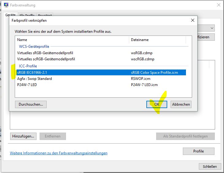 Möglicherweise müssen Sie in den Windows-Einstellungen zuerst noch ein sRGB-Profil verfügbar machen, bevor Sie die oben beschriebene Zuweisung machen können: