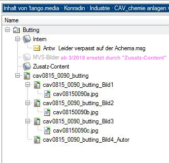 - Im Unterordner „Zusatz-Content“ Wenn ein Beitrag für Online aufbereitet wird, dann wird zunächst der Hauptartikel gesucht, der im Themenordner liegt, dann bekommt dieser Hauptartikel alle Unterartikel zugewiesen, die in der tango-Hierarchie darunter hängen, und zusätzlich werden dann noch alle „Artikel-Bild-Pärchen“ zugeordnet, die in „Zusatz-Content“ liegen.