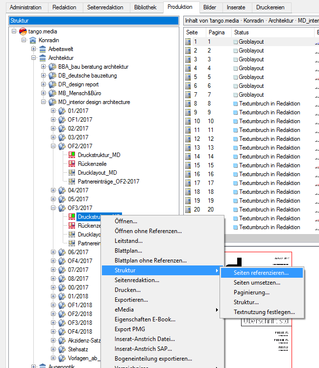 5. Mit Rechtsklick auf Druckstruktur den Befehl wählen “Struktur” dann “Seiten referenzieren…