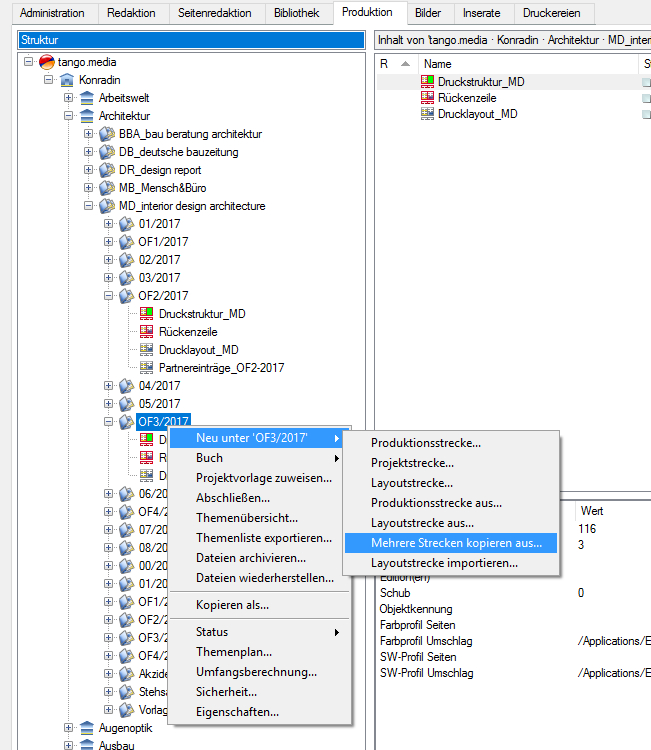 1. Im Reiter “Produktion” die nächste Ausgabe auswählen und mit der rechten Maustaste klicken auf “Neu unter…” dann “Mehrere Strecken kopieren aus…” (auch wenn wir eigentlich nur an einer Strecke interessiert sind).