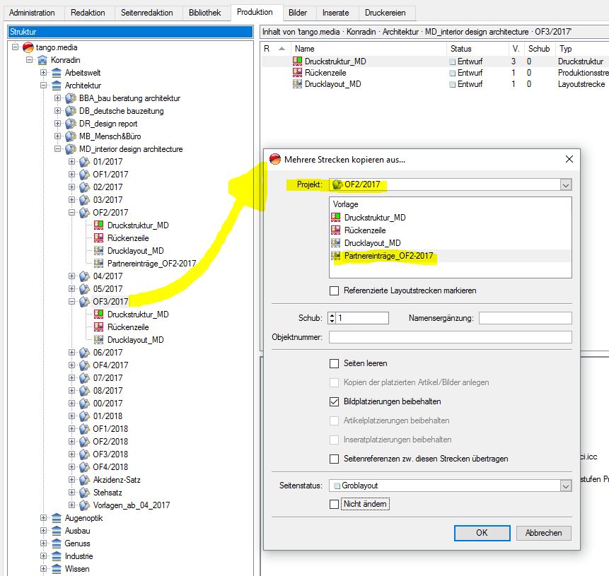 2. Im folgenden Dialog wählen Sie zunächst unter “Projekt” die vorherige Ausgabe aus. Darunter dann die Layoutstrecke, auf deren Basis das AM die Veränderungen sammelt und das Layout die Veränderungen umsetzt (“Partnereinträge_OFx-xxxx”). Bitte beachten Sie auch die anderen Einstellungen (z.B. Häkchen darf nur bei “Bildplatzierungen behalten” gesetzt sein).