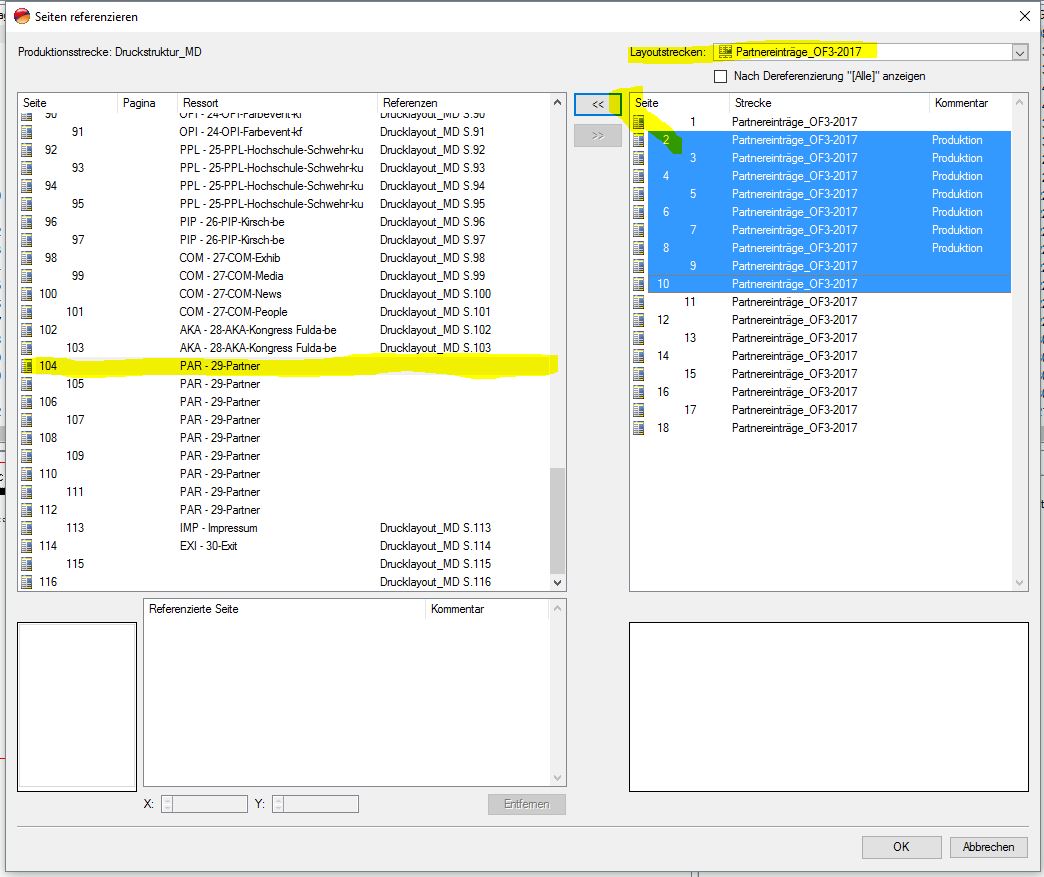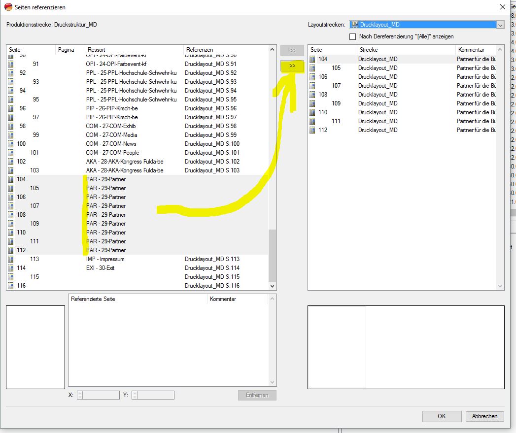 6. Suchen Sie in der linken Fensterhälfte (Druckstruktur) in der Spalte “Ressort” nach den Seiten, auf denen die Partnereinträge eingeplant sind. Dann lösen Sie zunächst die alte Referenz, indem Sie die bisher referenzierten Seiten der Strecke “Drucklayout” markieren und dann oben in der Mitte auf die Schaltfläche mit den zwei Rechtspfeilen [ >> ] klicken. (Screenshot zeigt Ansicht nachher!)