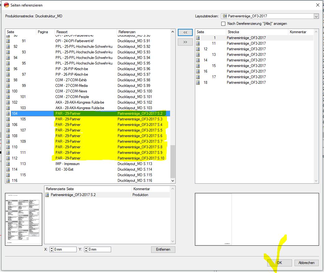 8. Am Ende bitte kontrollieren, ob die Seiten vor und nach den Partnereinträgen auf das Drucklayout referenziert sind, wie es gewünscht ist.