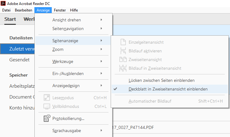 - bei Bedarf kann man im Adobe-Reader die gewohnte Doppelseiten-Ansicht einrichten (Menü Anzeige/Seitenanzeige/Zweiseitenansicht mit Option Deckblatt, siehe Screenshot)
