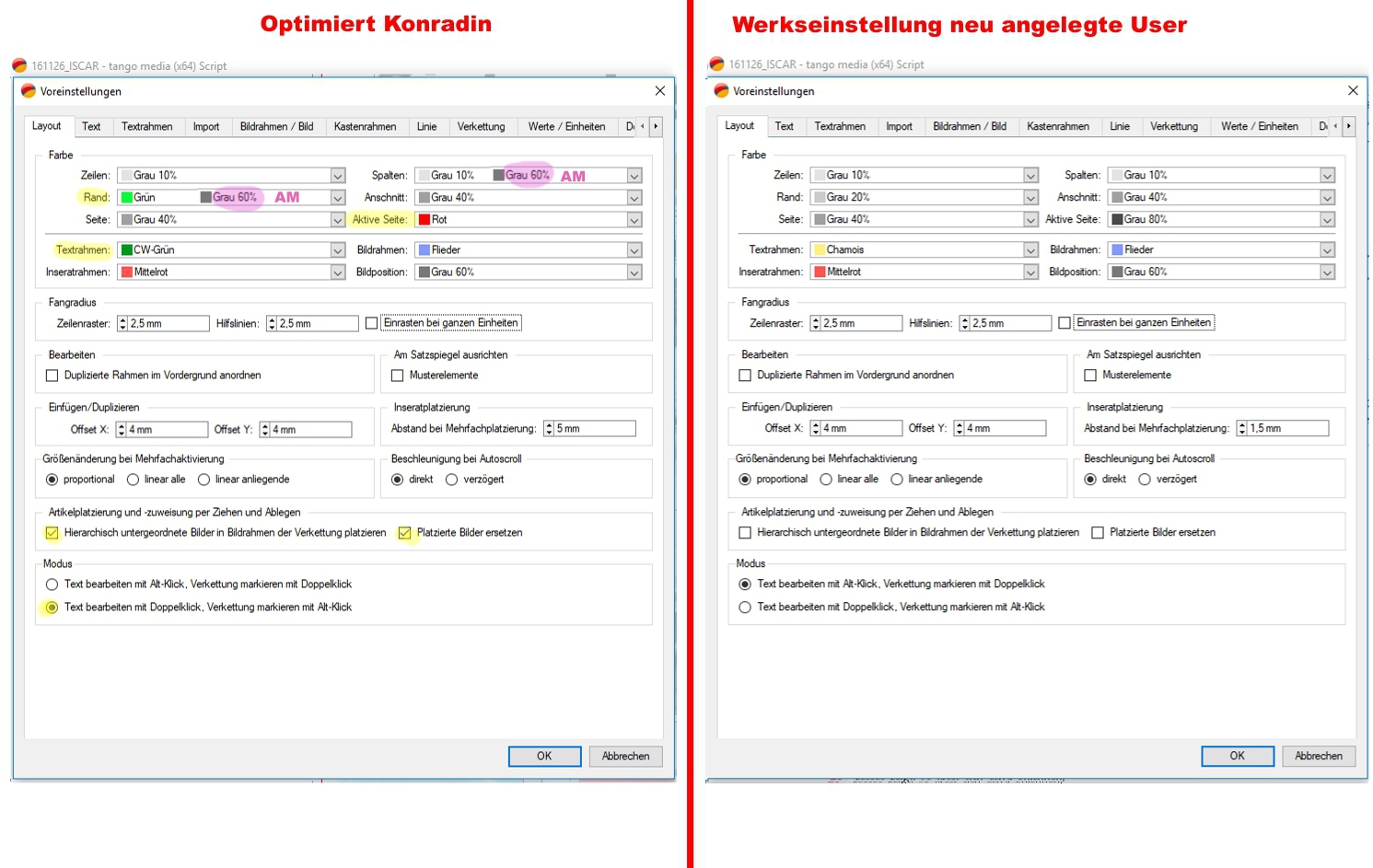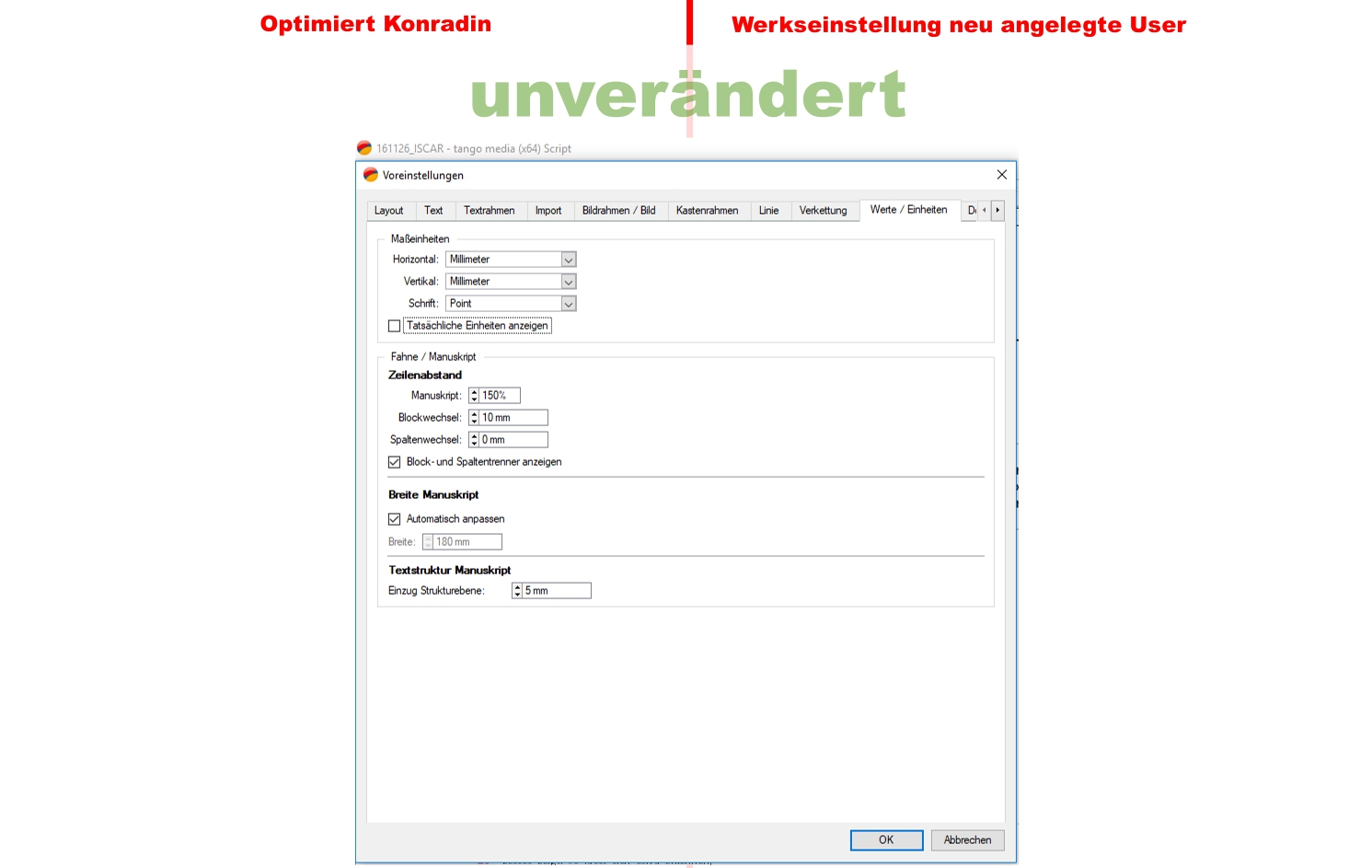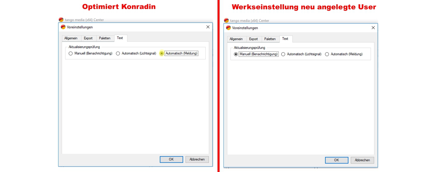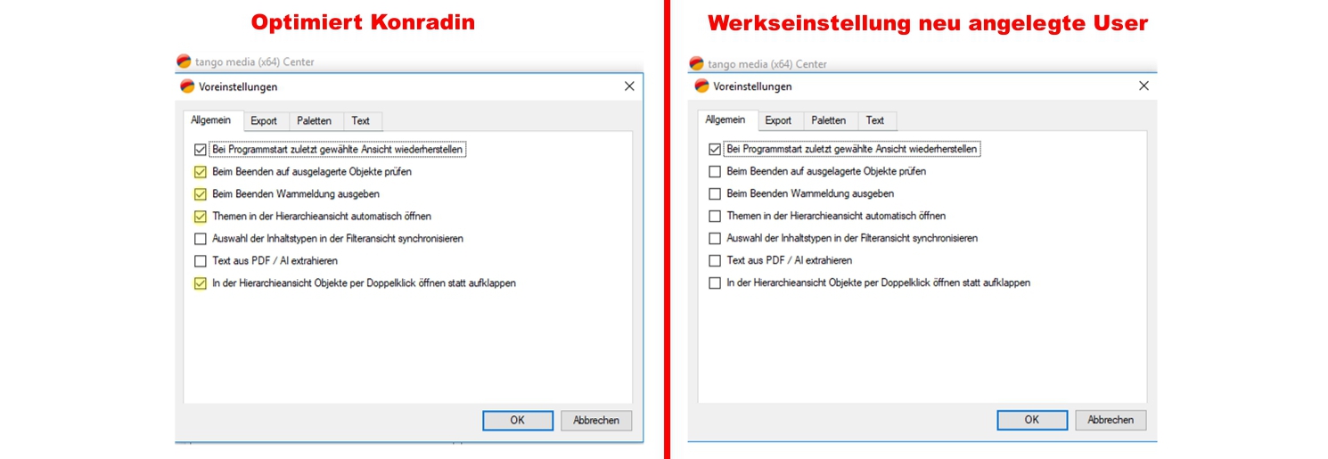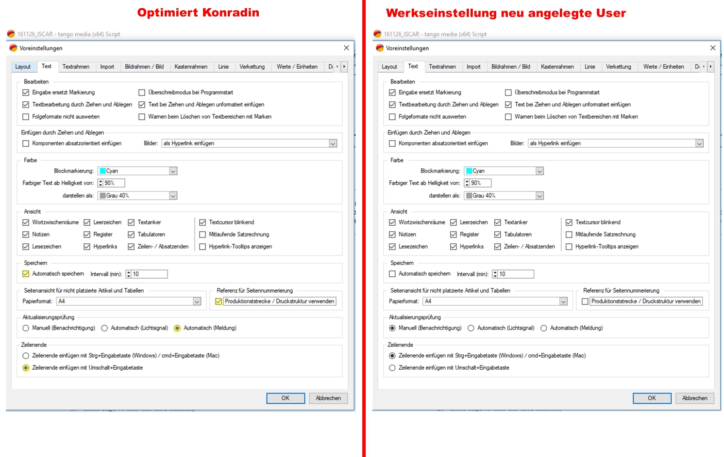 Voreinstellungen sind in tango stets verknüpft mit dem User-Profil. Jeder neu angelegte User startet zunächst mit Werkseinstellungen. Die erwiesen sich in der Praxis bei Konradin allerdings nicht immer als optimal (z.B. kein automatisches Speichern von Artikeln). So ergab sich eine “optimierte Konradin-Grundeinstellung”, deren Abweichungen in den Screenshots unten gelb hervorgehoben sind (links). Die Werkseinstellungen stehen zum Vergleich gegenüber (rechts).