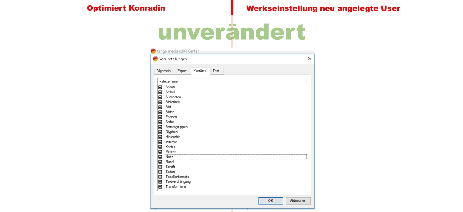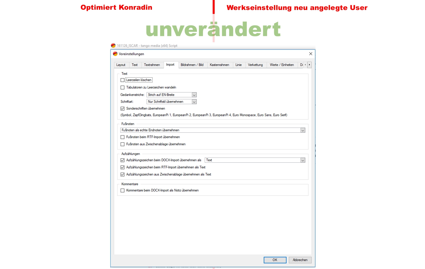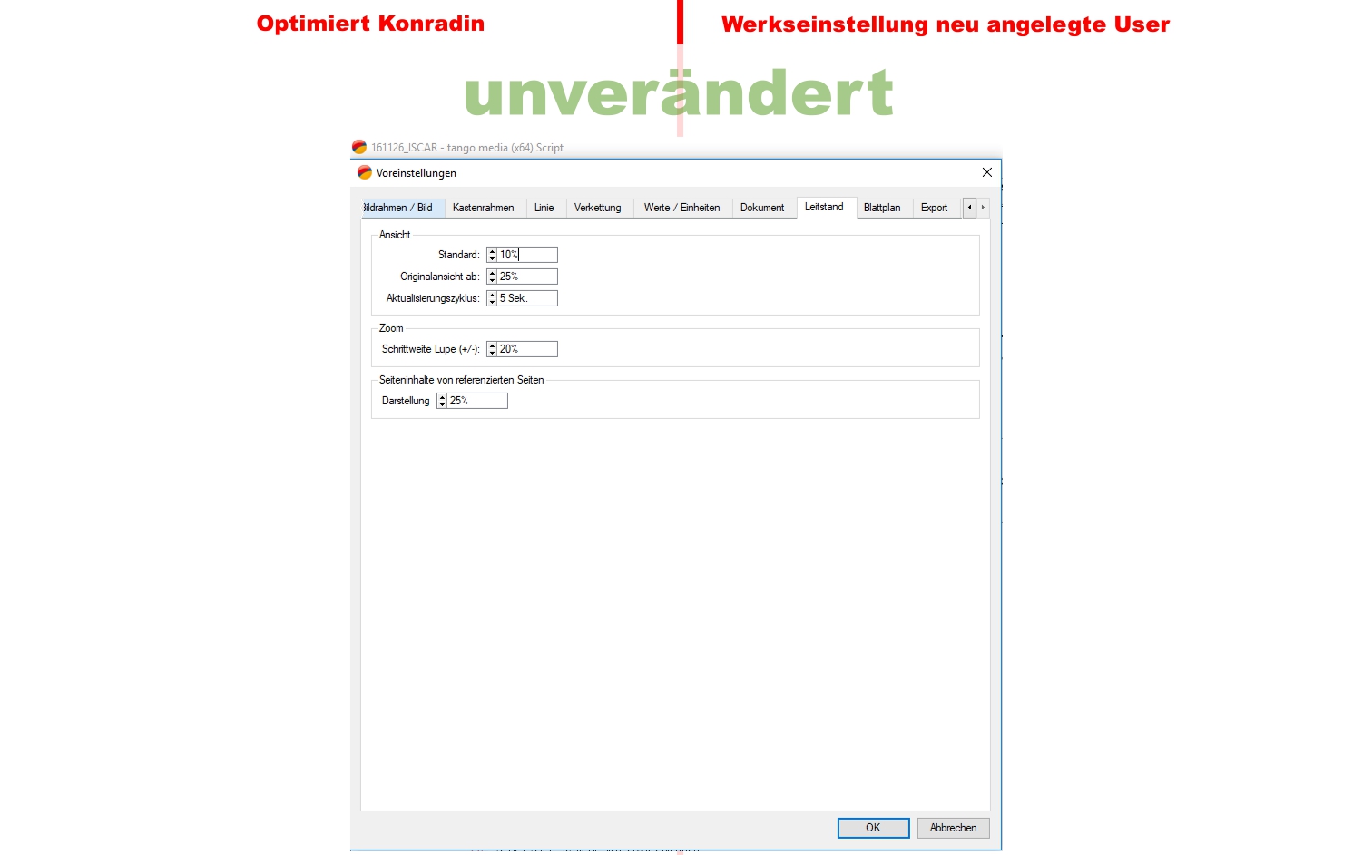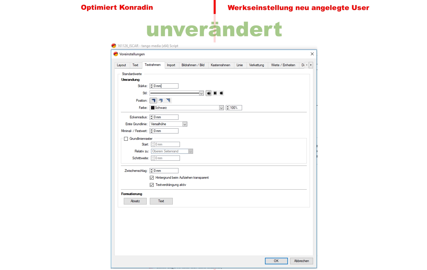 Voreinstellungen sind in tango stets verknüpft mit dem User-Profil. Jeder neu angelegte User startet zunächst mit Werkseinstellungen. Die erwiesen sich in der Praxis bei Konradin allerdings nicht immer als optimal (z.B. kein automatisches Speichern von Artikeln). So ergab sich eine “optimierte Konradin-Grundeinstellung”, deren Abweichungen in den Screenshots unten gelb hervorgehoben sind (links). Die Werkseinstellungen stehen zum Vergleich gegenüber (rechts).