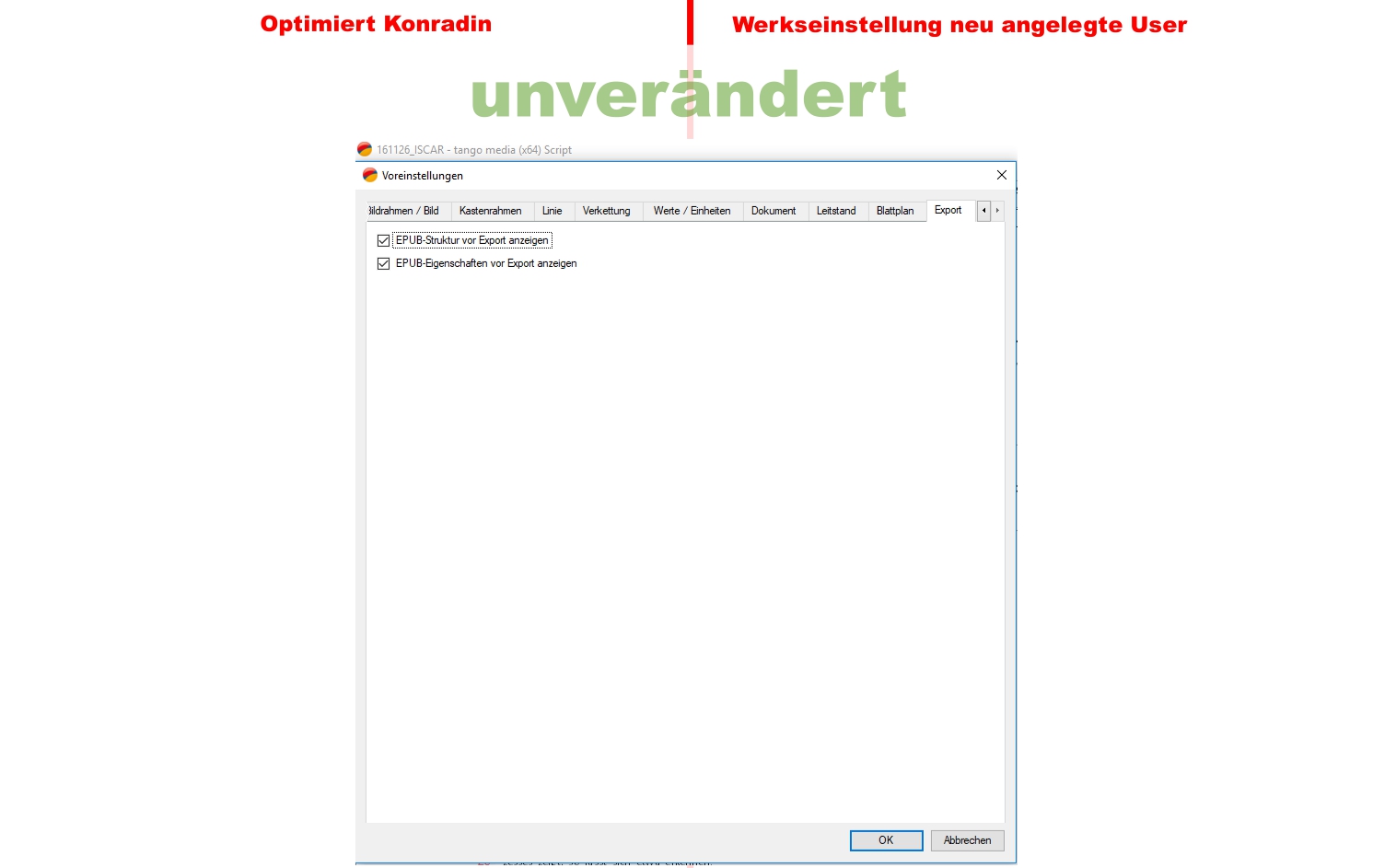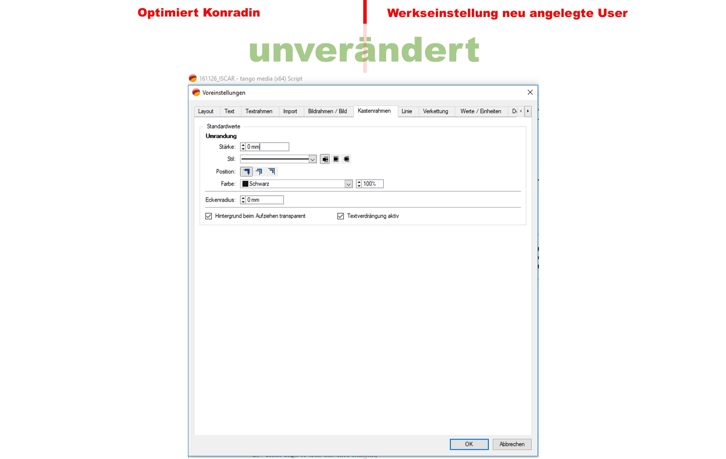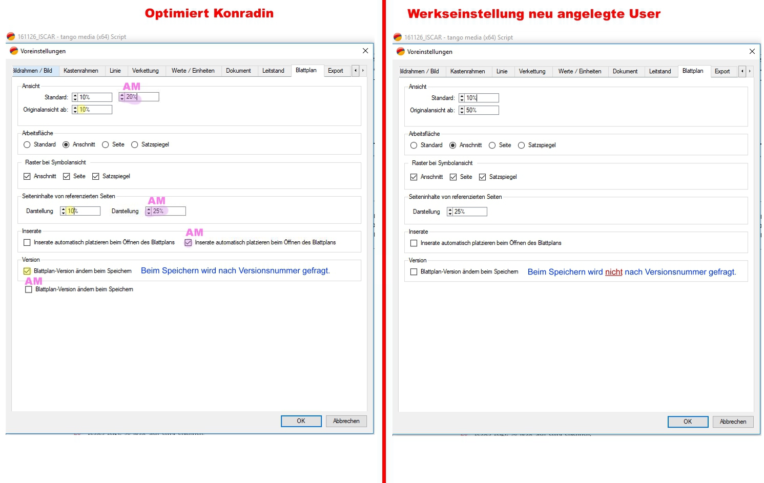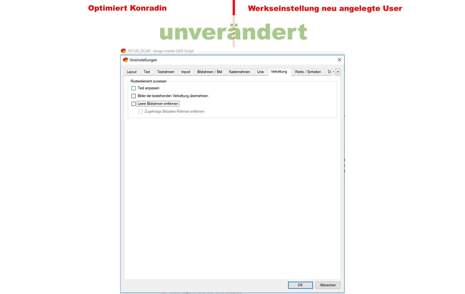 Voreinstellungen sind in tango stets verknüpft mit dem User-Profil. Jeder neu angelegte User startet zunächst mit Werkseinstellungen. Die erwiesen sich in der Praxis bei Konradin allerdings nicht immer als optimal (z.B. kein automatisches Speichern von Artikeln). So ergab sich eine “optimierte Konradin-Grundeinstellung”, deren Abweichungen in den Screenshots unten gelb hervorgehoben sind (links). Die Werkseinstellungen stehen zum Vergleich gegenüber (rechts).