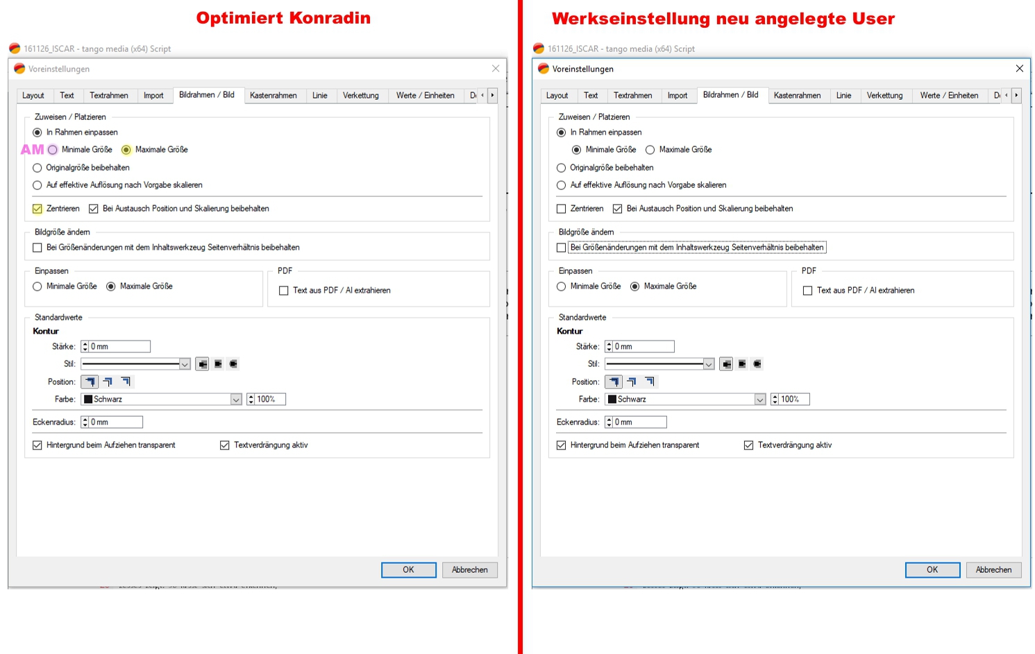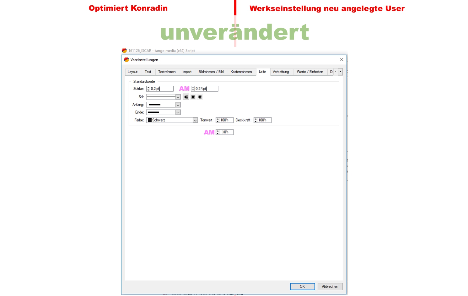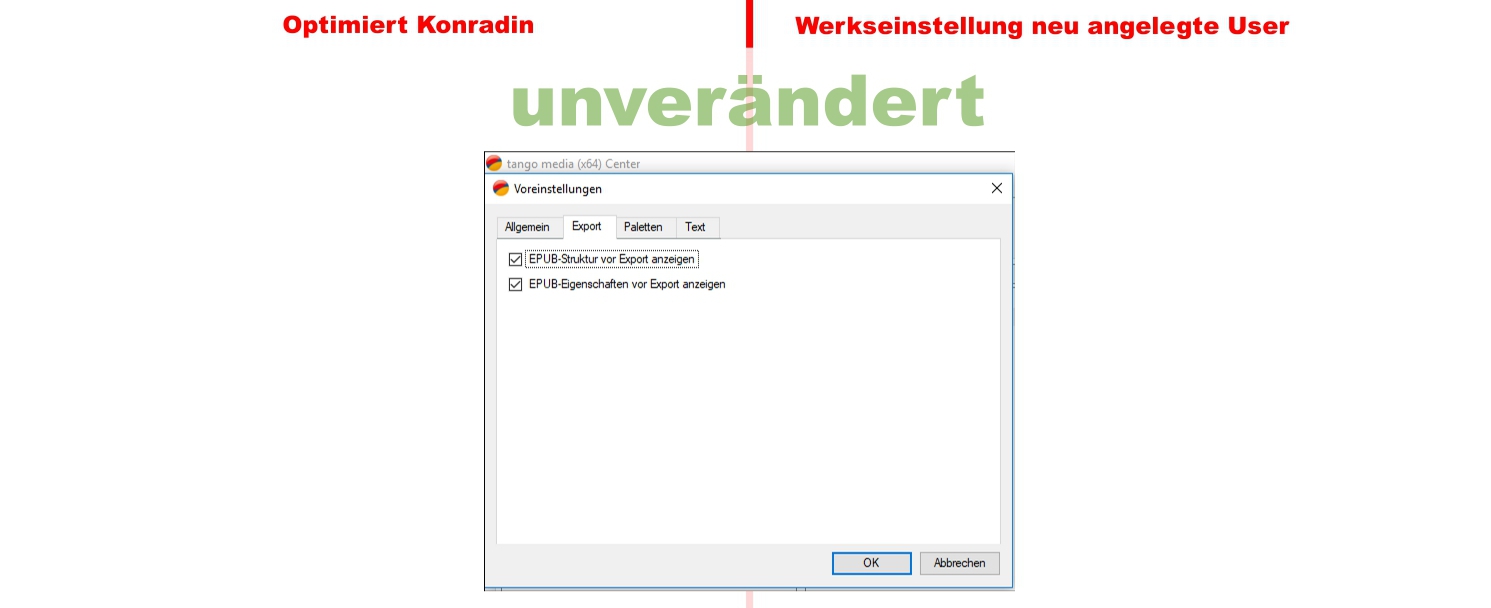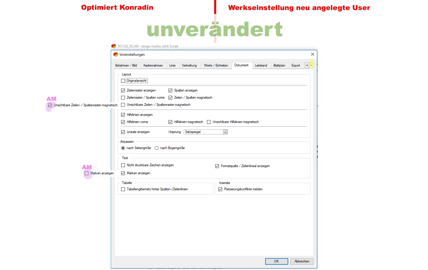 Voreinstellungen sind in tango stets verknüpft mit dem User-Profil. Jeder neu angelegte User startet zunächst mit Werkseinstellungen. Die erwiesen sich in der Praxis bei Konradin allerdings nicht immer als optimal (z.B. kein automatisches Speichern von Artikeln). So ergab sich eine “optimierte Konradin-Grundeinstellung”, deren Abweichungen in den Screenshots unten gelb hervorgehoben sind (links). Die Werkseinstellungen stehen zum Vergleich gegenüber (rechts).