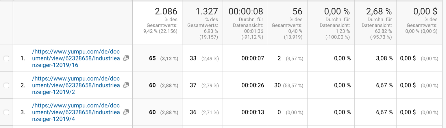 Voraussetzung: bei jeder Ausgabe in Yumpu ist die richtige Google-Analytics-Tracking-ID eingetragen. Dann werden die Zugriffe auf das Epaper und die jeweiligen Seiten in Google Analytics mitgetrackt.