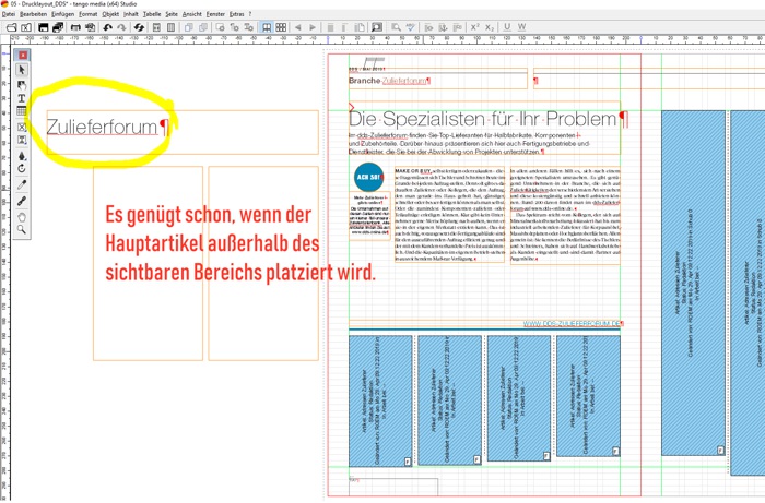 2. Der Hauptartikel muss im Layout platziert sein (notfalls auch unsichtbar auf der Montagefläche). Das heißt umgekehrt: Ein roter Punkt am Hauptartikel deutet auf einen späteren Fehler hin! (Nicht-platzierte Artikel werden in der Verarbeitung ignoriert, weil die Funktion für den Heft-Belegversand programmiert wurde. Dabei ist es gewünscht, dass z.B. reine Online-Artikel “herausfallen” oder gar Meldungen, die kurzfristig aus dem Layout genommen wurden, um Platz für ein Inserat zu machen…)
