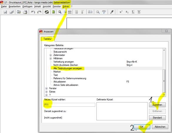 - Empfehlung: In Seitenredaktion Tastaturkürzel F11 definieren für Ansicht / „Alle Textnutzungen anzeigen“ (siehe Screenshot unten)