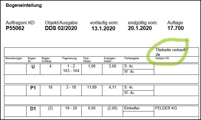 Das AM informiert in der Bogeneinteilung den Vertrieb (Frau Fiori) und die Medienproduktion (Frau Apel und die Objektverantwortliche), welche Art von Titelflappe verkauft wurde (s.u.). Beim Layout ist zu beachten: