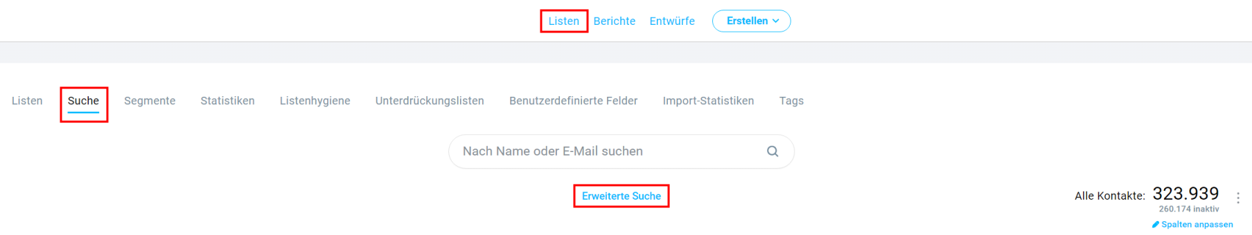 1. Klicken Sie auf “Listen”, dann auf “Suche” und “Erweiterte Suche”.