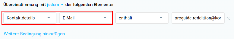 3. Wählen Sie “Kontaktdetails” und “E-Mail” aus und suchen dann mit “enthält” oder “entspricht” nach der E-Mail-Adresse.