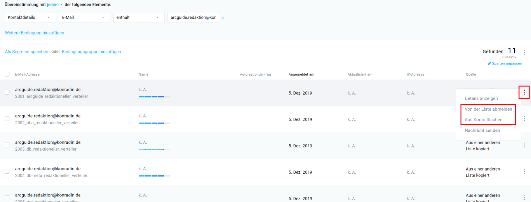 4. Die E-Mail-Adresse wird dann in ggf. mehrfacher Ausführung angezeigt: für jede Verteilerliste, auf der die Adresse steht. Über das Menü mit drei Punkten rechts am Rand kann die Adresse aus einer Liste abgemeldet oder aus dem gesamten GetResponse-Konto gelöscht werden.