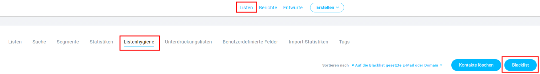5. Handelt es sich um eine Löschanfrage bzw. Beschwerde aus Datenschutzgründen, sollte zusätzlich der Kontakt noch in die Blacklist aufgenommen werden. Hierzu muss auf “Listen”, “Listenhygiene” und den Button “Blacklist” geklickt werden.