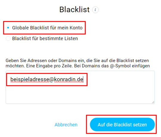5. Handelt es sich um eine Löschanfrage bzw. Beschwerde aus Datenschutzgründen, sollte zusätzlich der Kontakt noch in die Blacklist aufgenommen werden. Hierzu muss auf “Listen”, “Listenhygiene” und den Button “Blacklist” geklickt werden.